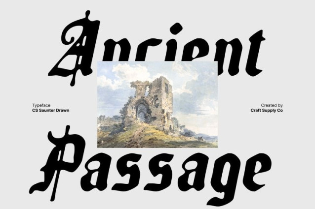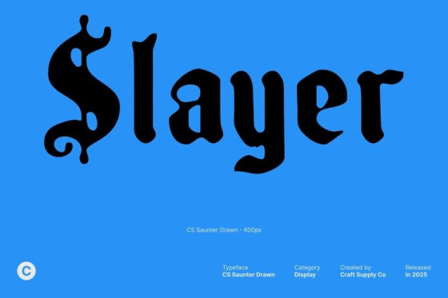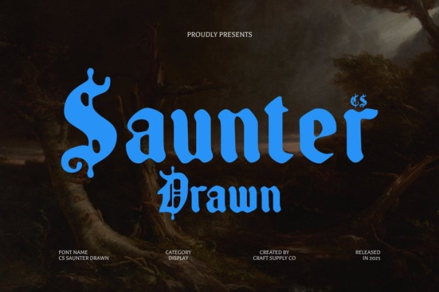 CS Saunter Drawn Font This is a decorative Blackletter display font that embraces classic gothic heritage while presenting it through refined, aesthetic strokes. Its sharp yet elegant letterforms carry an unmistakable sense of mystery and depth, evoking historical manuscripts, medieval calligraphy, and timeless craftsmanship.