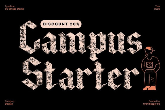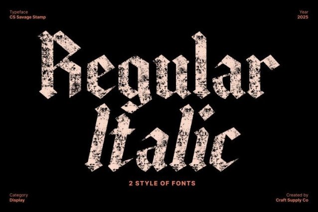 CS Savage Stamp Font This is a Gothic display font crafted to deliver intensity, drama, and artistic depth. Its bold, classic Gothic letterforms create a striking visual presence, while the distressed stamp effect adds rugged texture and vintage authenticity. The result is a typeface that feels mysterious, expressive, and unforgettable perfect for designers who want a font that commands attention with powerful style.