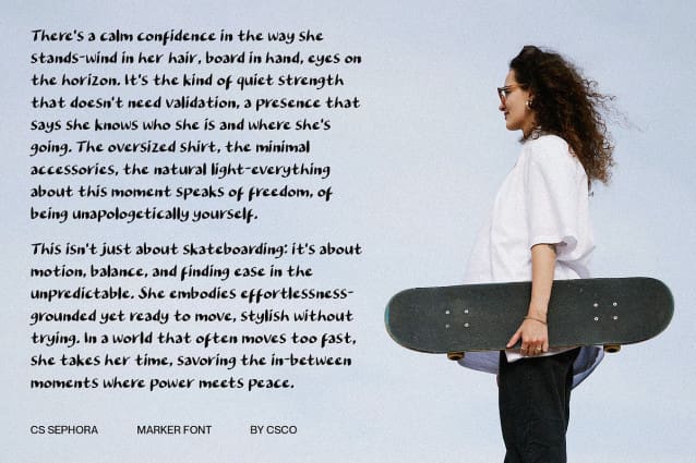 CS Sephora Font – This is a bold handwritten marker font that combines the structure of a sans serif with the freedom of natural handwriting. Each stroke feels authentic and spontaneous, creating a visual rhythm that’s both polished and expressive. Its handcrafted texture adds a human touch, making every letter feel alive and engaging.