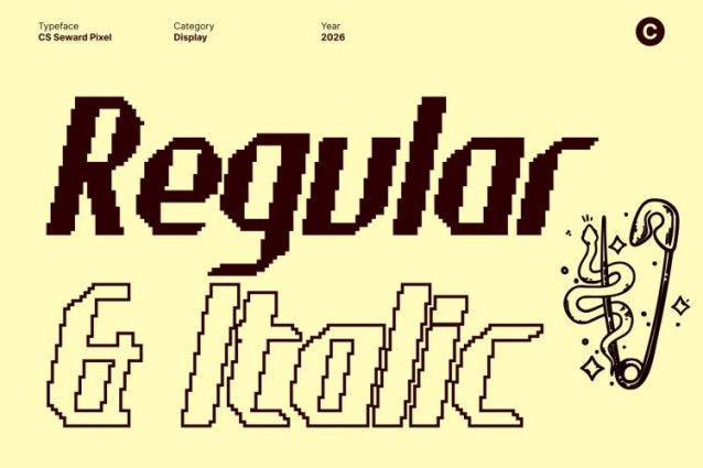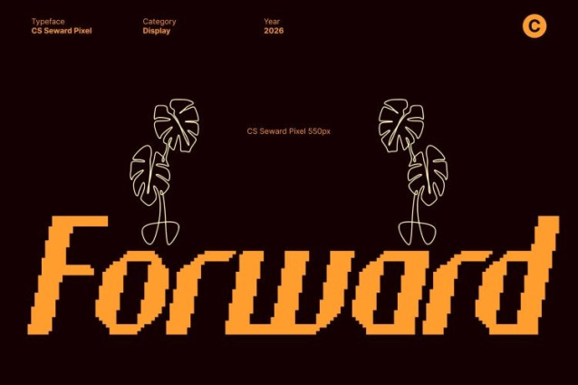 CS Seward Pixel Font This is a bold industrial display font that embodies strength, grit, and confidence. Built with solid proportions and assertive shapes, this typeface carries a commanding presence that feels tough and unapologetic. Its masculine character makes it ideal for designs that demand authority and visual impact.