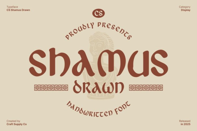 CS Shamus Drawn Font This is a display font inspired by uncial letterforms, known for their rounded curves and historical significance. These distinctive shapes echo ancient manuscripts and early calligraphic traditions, bringing a sense of heritage, authority, and timeless beauty into contemporary design. The uncial influence creates a strong visual identity that feels classic, cultured, and rich with historical depth.