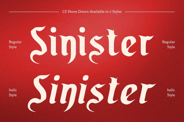 Hand-Drawn Artistic Texture What sets CS Shore Drawn apart is its drawn texture, which softens the rigidity of traditional Gothic fonts. The handcrafted detailing adds depth and artistry, transforming each character into something mysterious and expressive. It feels both historical and handmade, bridging the gap between heritage and creativity.