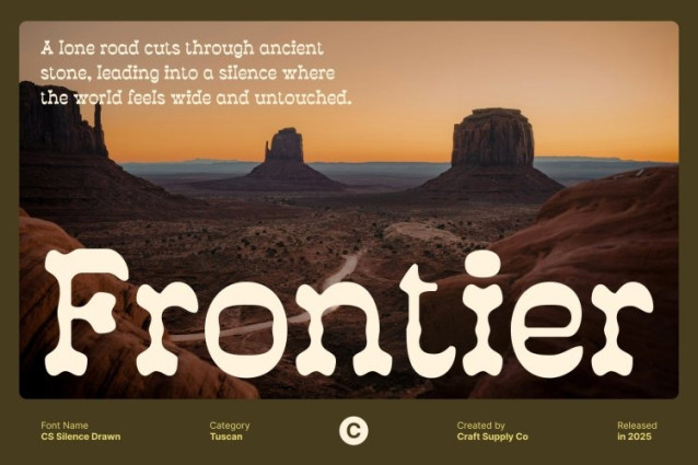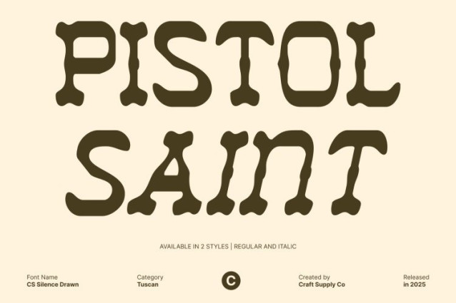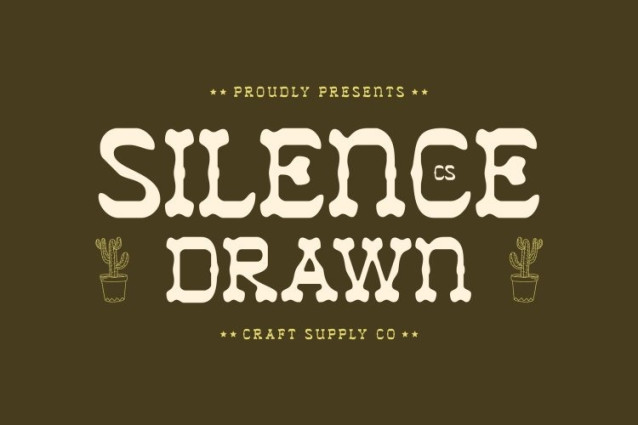 CS Silence Drawn Font – This is an inspired display typeface that blends traditional vintage design elements with distinctive Tuscan serif styles. Its decorative serifs, dramatic contrasts, and expressive letterforms reflect classic typographic traditions often associated with historical signage and ornamental lettering.