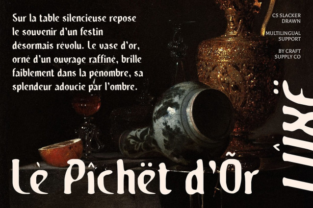 CS Slacker Drawn Font – This font is a modern blackletter font that breaks tradition with bold forms and unique shapes. While it inherits the dramatic essence of historical blackletter, its drawn texture adds a handmade and artistic quality, giving each letter character and depth. This makes the font both classic and contemporary, suitable for designs.