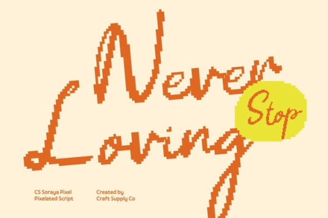 CS Soraya Pixel Font This is a playful vacation-inspired script font that captures the joyful freedom of sunny escapes and laid-back summer days enhanced with subtle pixel detailing. Its flowing strokes and breezy rhythm reflect spontaneous handwriting, while gentle pixel accents introduce a fresh, modern twist. The result is a script that feels relaxed, uplifting, and digitally refined.