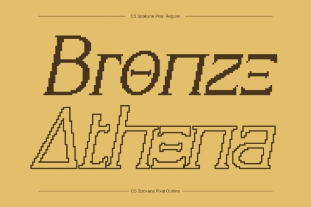 CS Spokane Pixel Font This is a refined serif display font inspired by the sculptural beauty of ancient Greek design, enhanced with subtle pixel detailing. Its chiseled serifs and balanced proportions echo classical architecture, while crisp digital precision introduces a modern sensibility. The result is typography that feels cultured, poised, and distinctly contemporary.