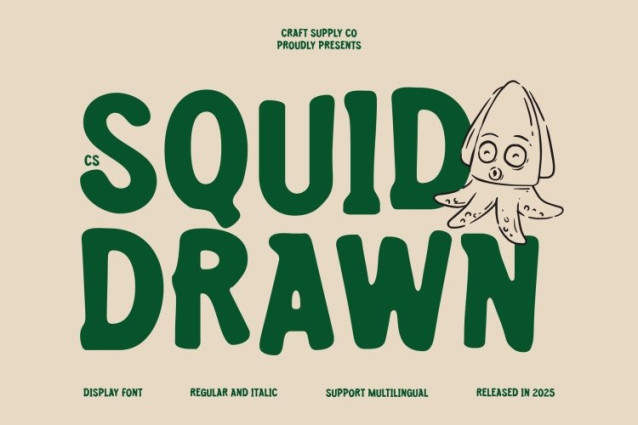 CS Squid Drawn Font – This is a playful and energetic display font featuring bold strokes and friendly, approachable shapes. The drawn effect adds a natural, handcrafted texture, giving every letter a lively, artistic personality that instantly captures attention. This font brings a sense of fun and creativity to any design project.