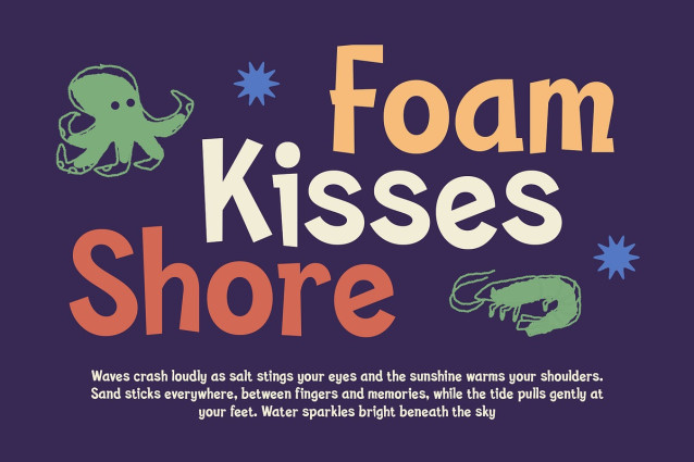 Vibrant and Full of Personality CS Squid – Cute Font’s funky vibe ensures it brings a lively and distinctive character to any design. Its bold style ensures visibility and impact, while its cute details add a unique personality that grabs attention. Whether it’s used for branding, packaging, or digital designs.