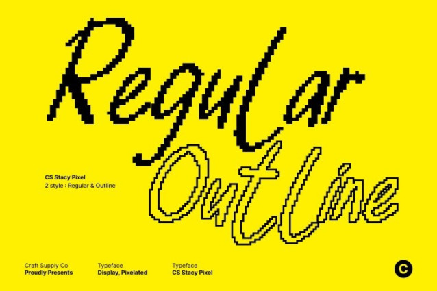 CS Stacy Pixel Font This is an organic hand-drawn font that blends the charm of handmade lettering with eye-catching pixel style. Its expressive strokes and natural imperfections are infused with subtle pixel-inspired details, creating a unique fusion of warmth and digital nostalgia. The result is a font that feels lively, textured, and full of personality perfect for designs that want both authenticity and retro flair.