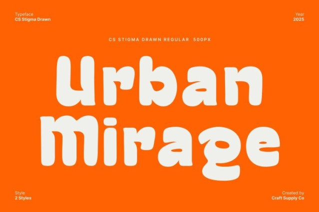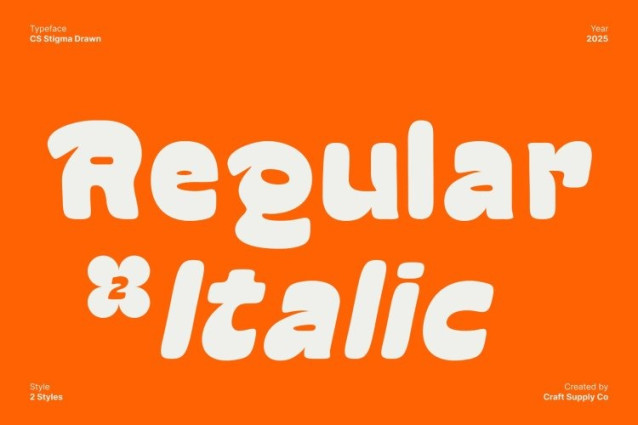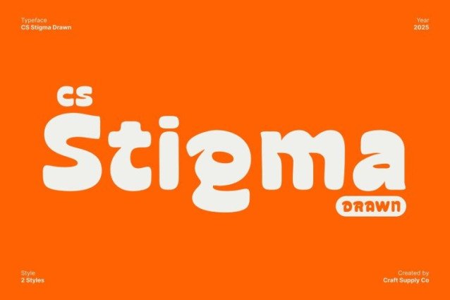 CS Stigma Drawn Font This is a bold display font crafted to make every message stand out with power and clarity. Its heavy, confident letterforms create a striking visual impact, making it perfect for headlines, posters, and bold branding that needs to grab attention instantly. The funky shape style adds a playful twist, blending strength with personality.