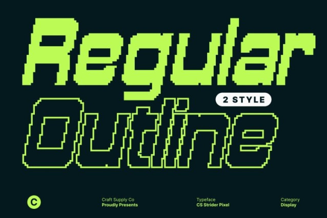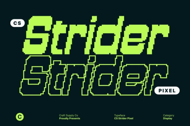 CS Strider Pixel Font This is a reverse contrast display font that fuses vintage charm with modern digital attitude. By inverting the traditional weight distribution, it creates striking visual tension and a dynamic rhythm that immediately draws attention. Subtle pixel-inspired detailing sharpens its structure, giving each letter a crisp, screen-ready presence full of confidence and individuality.