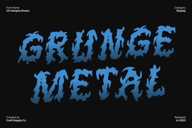 CS Vampire Drawn Font This is a black metal display font crafted to embody raw aggression and uncompromising darkness. Jagged spikes, razor-sharp edges, and violently fractured strokes define every letter, creating a hostile and menacing visual presence. The structure feels intentionally unstable and chaotic, echoing the destructive sound and ideology of extreme music.