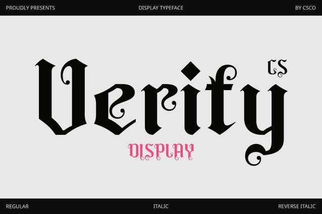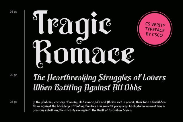 Ideal for Artistic and Unique Projects Perfect for headlines, logos, and any material requiring a strong, captivating character, CS Verity adds an artistic touch to your projects. Its ability to combine historical Gothic influences with contemporary flair makes it ideal for designs aiming to evoke a sense of intrigue and sophistication. Whether you’re creating mystical themes, historical references, or unique branding elements, this font ensures your visuals stand out with a bold and enchanting presence.