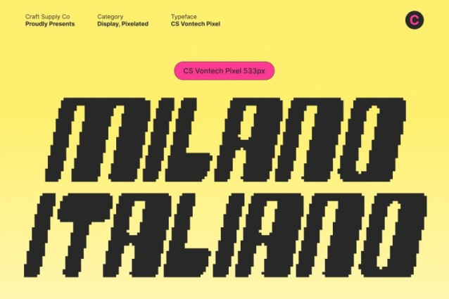 CS Vontech Pixel Font This is a bold Y2K-inspired display font that captures the vibrant optimism of early 2000s digital culture. Built with strong geometric construction and distinct pixel-infused detailing, it radiates high-energy nostalgia with a sharp modern twist. Designed to stand out, it transforms typography into a powerful visual statement filled with futuristic confidence.