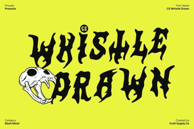 CS Whistle Drawn Font This is a black metal font designed to capture raw intensity and uncompromising energy. Its jagged spikes, chaotic strokes, and angular shapes create a sense of darkness and power, making every letter visually striking. The font conveys a bold and aggressive aesthetic that instantly communicates extreme and edgy themes.