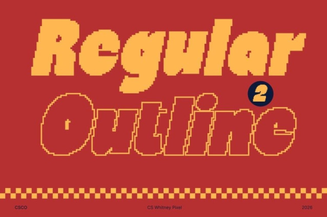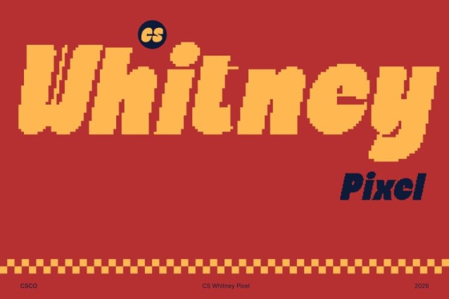 CS Whitney Pixel Font This is a bold, chunky display sans serif that blends strong blocky construction with subtle pixel-inspired detailing. Its confident letterforms project modern strength, while digital pixel accents introduce a playful twist that makes each character feel distinctive and energetic.