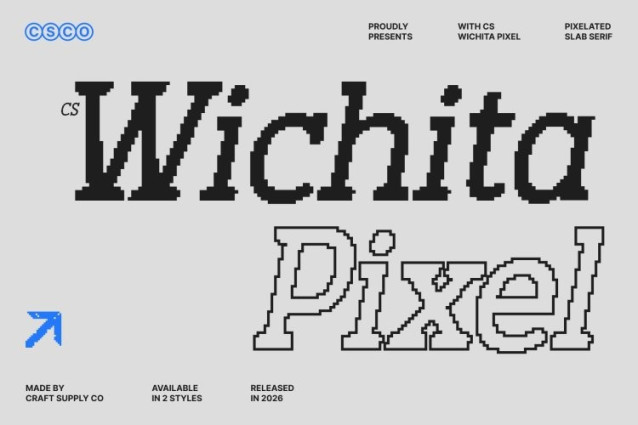 CS Wichita Pixel Font This is a slab serif display font that blends clean, confident structure with distinctive pixel detailing. Built on sturdy slab serifs and balanced proportions, this font delivers strength and clarity while introducing a subtle old-digital feel. The pixel construction adds a retro-tech nuance, giving the typeface a modern yet nostalgic character that feels rooted in digital culture.