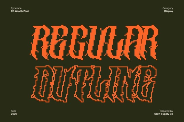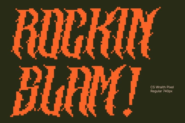CS Wraith Pixel Font This is a raw and aggressive black metal display font forged from chaos, distortion, and digital brutality. Defined by jagged spikes, uneven strokes, and a rigid pixel-based structure, this font embodies the unrestrained energy of extreme music. Built in a bitmap style, each letter feels sharp, hostile, and uncompromising making it a powerful choice for designs that demand darkness.