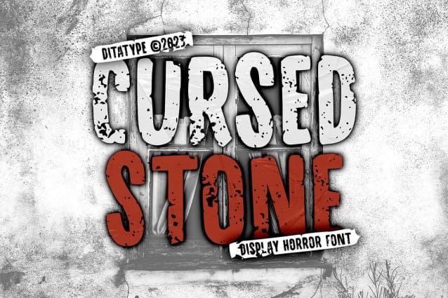 Cursed Stone font is made for personal use. Get the full version of the fonts if you want to use it for commercial purposes by purchasing the licenses here: https://creativemarket.com/ditatype/31393047-Cursed-Stone?u=fontlot123