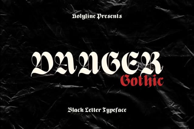 Danger Gothic Font by Holyline is a casual black letter typeface. This font comes with modern and unique shape inspire bh Old English style. It’s very unique, playful, elegant and very easy to combine with your design style. Danger Gothic perfect for headline, Magazine ,custom logo,packaging, quote, merchandise, watermark,social media posts, label, anything for your creativity and DangerGothic is perfect font if you want something new with your project.