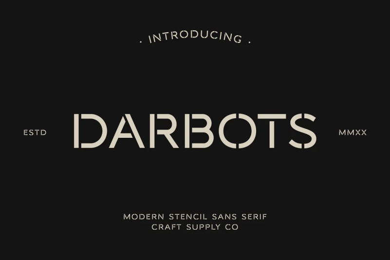 Darbots Font – Modern Stencil Sans Serif Font has been crafted from scratch with a structural logic of its own: a fusion of pure geometry and optical balance. By combining a variety of styles Darbots – Modern Stencil Sans Serif Font is suitable for Logo, greeting cards, quotes, posters, branding, name card, stationary, design title, blog header, art quote, typography