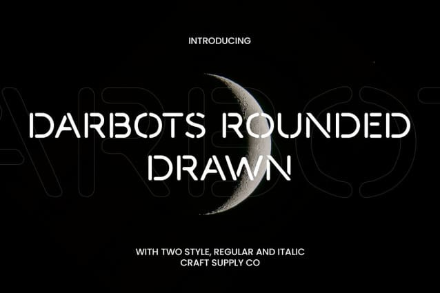 Darbots Rounded Drawn Font: Futuristic Meets Handcrafted. Modern Sans-Serif with Rounded and Stencil Shapes This is a modern sans-serif font that blends rounded letterforms with bold stencil shapes, creating a unique and contemporary look. The rounded edges offer a friendly and approachable vibe, while the stencil elements inject an industrial and cutting-edge feel. This combination makes it perfect for designs that need to balance modern aesthetics with an inviting and creative atmosphere.