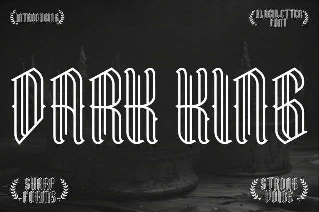 This font is ideal for tattoo-inspired graphics, luxury branding, poster titles, beverage packaging, or dramatic event promotions. It pairs perfectly with dark themes, metal band logos, or classic gothic designs while still feeling fresh for contemporary use. Dark King also includes numbers, punctuation, and symbols to support a wide range of design needs. Whether you’re working on a high-end label, an album cover, or a statement logo, this font delivers power, precision, and unforgettable style.