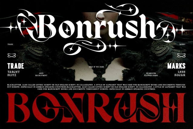 Dark Reborn draws its soul from historic Blackletter scripts, once used in medieval manuscripts and royal decrees, and reinvents it with bold modern serifs, sharp geometry, and ornamental detail. The result is a striking modern Gothic typeface that blends the rigid elegance of Old English with progressive design innovation.