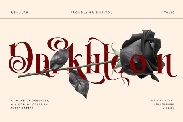 Darkbloom Font, a refined serif font that combines delicate sophistication with an enchanting edge. Perfect for elevating everything from luxurious packaging to high-end branding, Darkbloom’s distinctive letterforms and intricate details add a timeless allure to any project. With PUA encoding, effortlessly access a wide variety of unique glyphs and swashes, ensuring your creations capture attention with unparalleled elegance and charm. Let Darkbloom Font be the touch of elegance that brings your designs to life.
