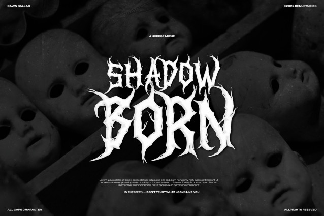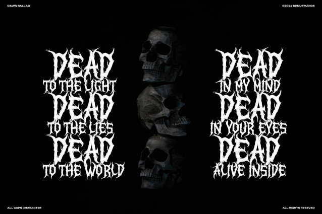 This font is used only for demos (Demo license). If you want to use this font for commercial use please contact: https://denustudios.com/dawn-ballad-black-metal-font/