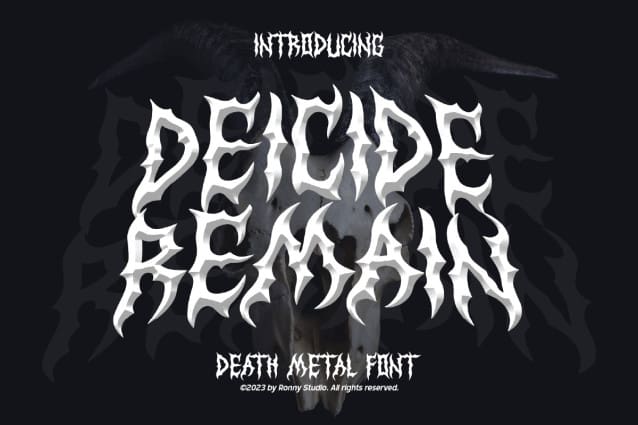 This font is used only for demos (Demo license). If you want to use this font for commercial use please contact: https://creativemarket.com/Ronny_Studio/12168231-Deicide-Remain-Death-Metal-Font?u=fontlot123
