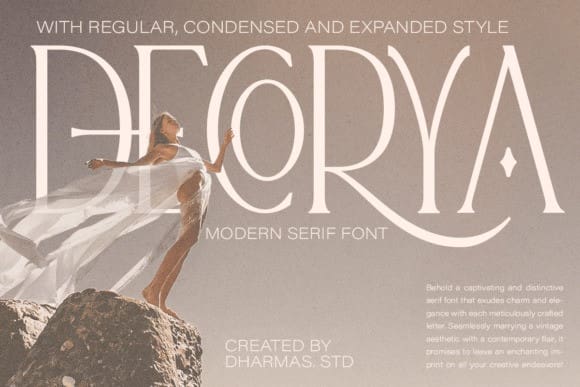 Dekorya Font is a beautiful and inspiring mix of classic calligraphy and modern serif with 46 unique ligatures and special alternates. Comes in 3 versions: Condensed, Regular, and Expanded