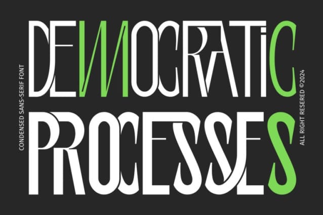 DEMOCRATIC PROCESSES Font – a dynamic mix and match typeface combining condensed and expanded sans-serif styles. A typeface inspired by the visuals of iconic sci-fi movies and TV shows. Every letterform is meticulously crafted to evoke a world where technology reigns supreme, and humanity grapples with its own creations. Whether you’re crafting eye-catching posters, impactful branding, striking headlines, or memorable logos, this font offers the perfect balance of contrast and cohesion. Elevate your design game with a font that’s both playful and powerful.