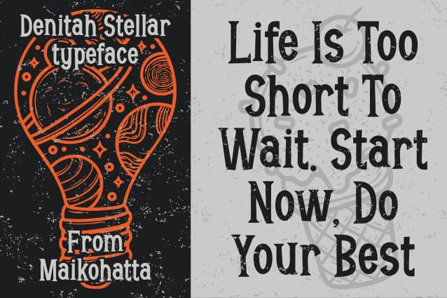 Denitah Stellar Font is used only for demos (Demo license). If you want to use this font for commercial use please contact: https://creativemarket.com/MaikoHatta/278616786-Denitah-Stellar-DecorativeTypeface?u=fontlot123