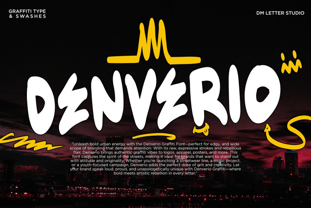 Denverio Font is a bold, street-inspired graffiti font that oozes urban attitude and untamed energy. With chunky, expressive strokes and a rebellious personality, Denverio brings raw street culture into logos, apparel, posters, and branding. The font comes with wild swashes that add even more grit and flair to your design, perfect for those who want to make a statement that’s loud, proud, and unforgettable.