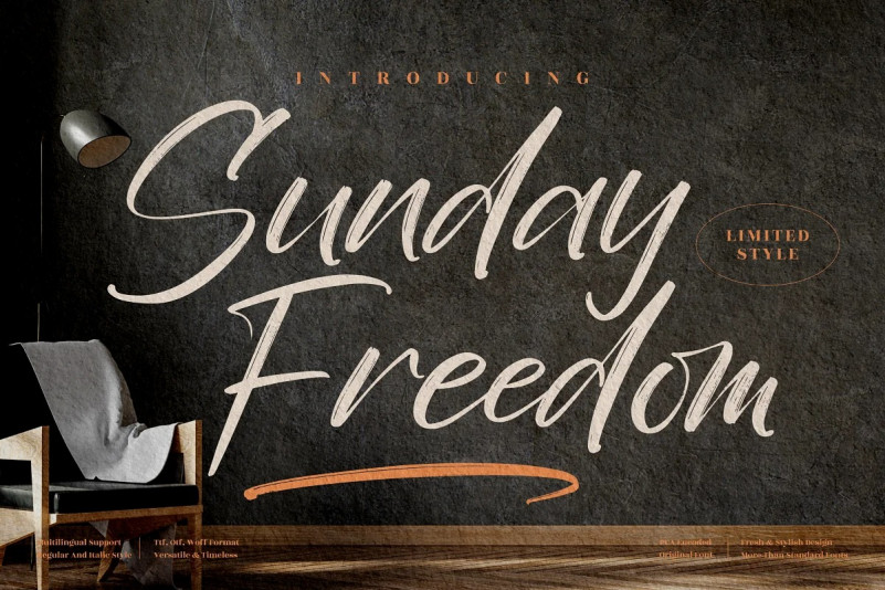 Sunday Freedom Brush Font by Perspectype Studio 9,900 downloads Found in: Brush Fonts, Script Fonts Sunday Freedom Brush Font