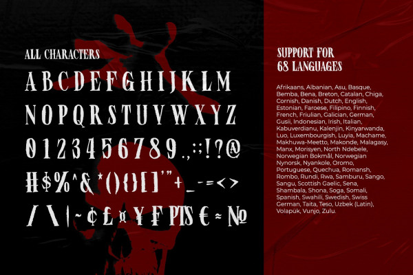 The brush details in Devil Inside give the font an organic and handcrafted appearance, as if it were inscribed with ancient symbols by a malevolent force. These haunting details add a sense of craftsmanship and enigma, creating an atmosphere of mystery and foreboding. For the best legibility you can use this font in the bigger text sizes. Enjoy the available features here.