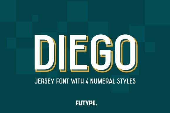Diego Font is a typeface made for football/soccer or other sports jersey/kit name and number.Complete with 4 different styles of numeral that you can choose for your team. Even though is made for sports, Diego is also good for other purposes.