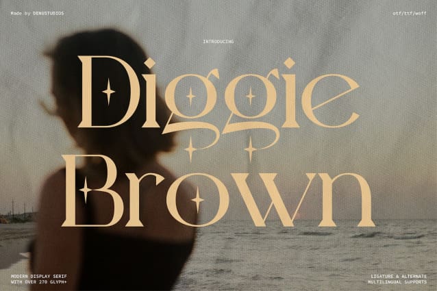 Diggie Brown | Modern Display Serif, from Denustudios, suitable for any projects such as: logos, branding projects, homeware designs, product packaging, mugs, quotes, posters, shopping bags, t-shirts, book covers, name card, invitation cards, greeting cards, label, photography, watermark, special events, and all your other lovely projects that need a Modern Display Serif taste.