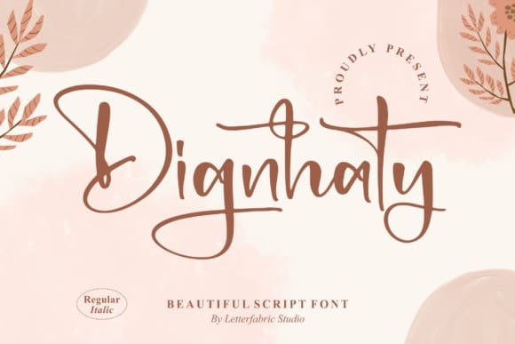 Dignhaty Script Font, is an elegant script font with a contemporary atmosphere and impeccable form, inspired by timeless classic calligraphy. This font is PUA encoded which means you can access all of the glyphs and swashes with ease!