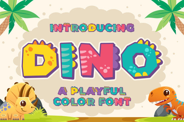 Dino Display Font a SVG Color Font Inspiring from Playful typography. This font is perfect for a design that makes it more attractive and playful. made with a very good level of aesthetics making this font suitable for book cover, poster, packging, merchandise, logotype and much more.