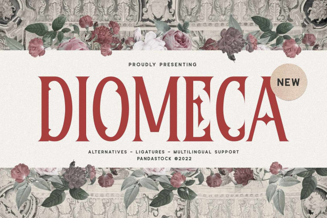 Diomeca is perfect for editorial covers, perfume and boutique branding, botanical packaging, posters, album covers, wedding invitations, and anything that requires dark elegance with a romantic touch.