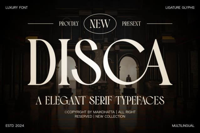 Disca Font – Elegant Serif Typeface. This font is a type of letter that has special characteristics that create the impression of luxury, elegance, and firmness. This font involves a series of design elements such as balanced thin and thick lines, gentle curves, and elegant and clean serifs. The sharp corners and fine details of each character create a highly aesthetic impression and exude an air of elegance.