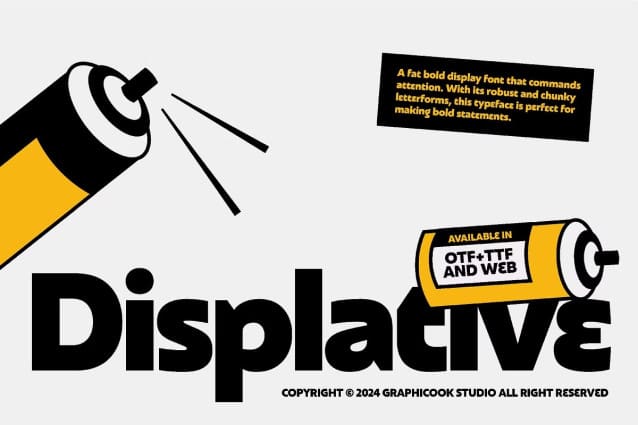 Displative is perfect for headlines, logotypes, magazines, packaging, quotes, movies, games, cover albums, book covers, and flyers, it’s a perfect solution for creating eye-catching designs that stand out in any context.