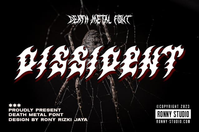 Dissident Death Metal font is made for personal use. Get the full version of the fonts if you want to use it for commercial purposes by purchasing the licenses here: https://creativemarket.com/Ronny_Studio/14493134-Dissident-Death-Metal-Font?u=fontlot123