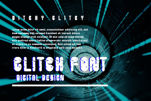 DITCHY GLITCY font features a futuristic and experimental display typeface with a very strong glitch touch. The bold letters with rounded shapes appear in a horizontal glitch cut effect, creating a visually striking impression of broken technology, cyberpunk, or digital error.