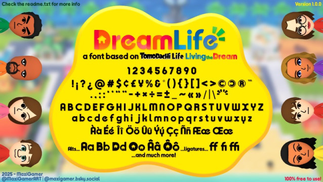 DreamLife Font is a geometric Bauhaus-styled font based on the typeface for the subtitle of the Nintendo Switch game Tomodachi Life: Living the Dream’s logo.