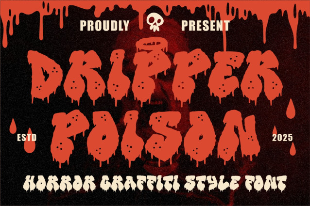Perfect for posters, branding, logos, stickers, packaging, movie titles, or any design needing a spooky urban vibe, Dripper Poison works well in both print and digital media. Whether you’re creating a Halloween party flyer, a horror movie poster, or edgy streetwear branding, this font brings a raw, fear-inducing impact that grabs attention instantly. Its bold shapes and high-contrast design ensure maximum legibility while keeping the dripping horror aesthetic intact.