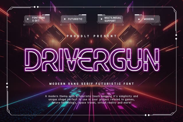 Drivergun Font, a cutting-edge modern sans serif font that embodies the essence of futuristic design. Perfect for innovators and visionaries, Drivergun offers a sleek, forward-looking aesthetic that propels text into a new dimension of style.