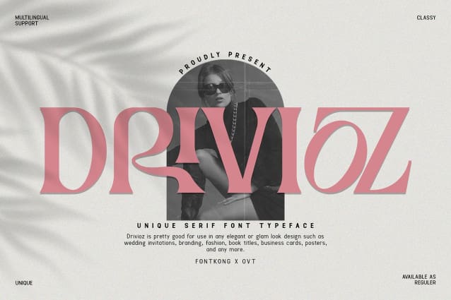 Drivioz Font, a unique serif typeface that stands out with its distinctive and creative design. This typeface is crafted for designers who seek to infuse their projects with personality and originality. Drivioz’s quirky curves and unexpected twists make it a perfect choice for those aiming to break the mold and present something truly one-of-a-kind.